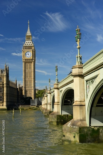 Naklejka premium Parliament building and Westminster bridge, London, England, U.K. The Cities government with Big Ben clock tower and the river Thames on a sunny September day.