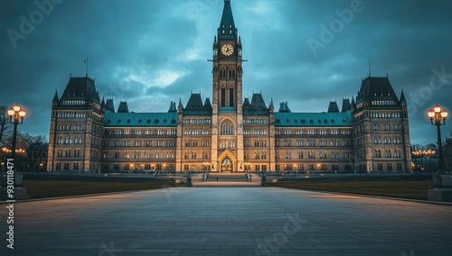 © Murda, Naklejka premium Parliament building at dusk with cobblestones.