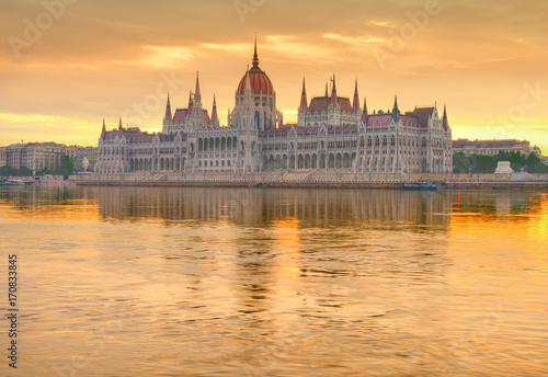 Fototapeta premium Parliament building in Budapest on a golden sunrise
