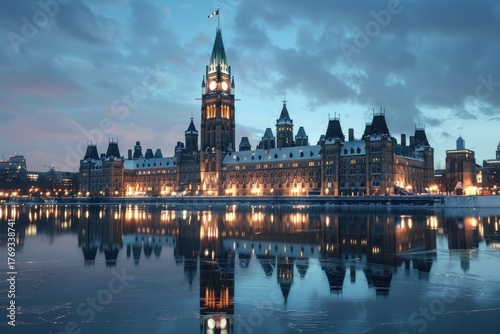 Obraz premium Parliament hill's iconic architecture lights up the winter twilight, reflecting beautifully on the frozen ottawa river