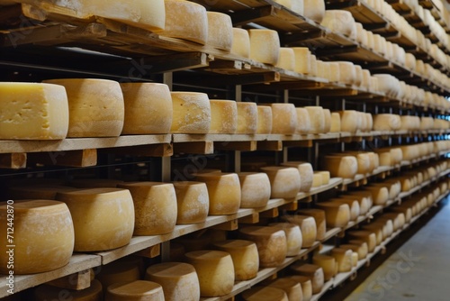 Fototapeta premium Parmesan cheese aging on shelves in factory warehouse, cheese production concept