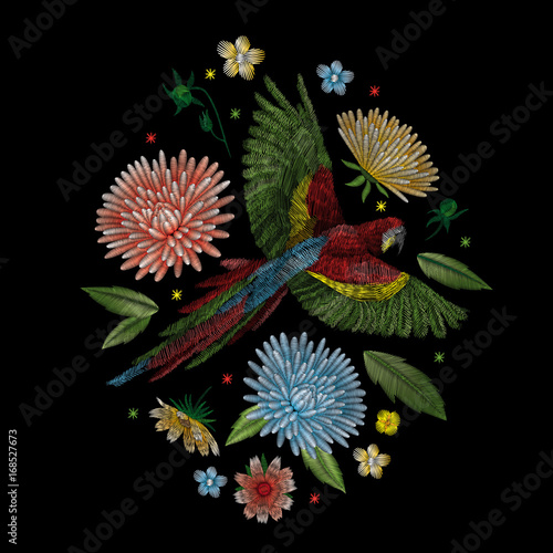 Obraz premium Parrot ara and dahlia flower. Traditional folk stylish stylish embroidery on the black background. Sketch for printing on fabric, clothing, bag, accessories and design. Trend vector