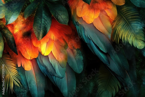 © Sami, Obraz premium Parrot feather patterns woven into a scene of tropical fruit trees, where the bright, vivid colors blend with the lush greenery, creating a lively, exotic atmosphere