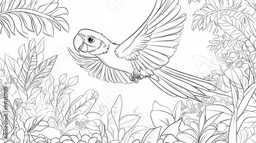 © AriyaniAI, Naklejka premium Parrot in Flight Amidst Lush Tropical Foliage
