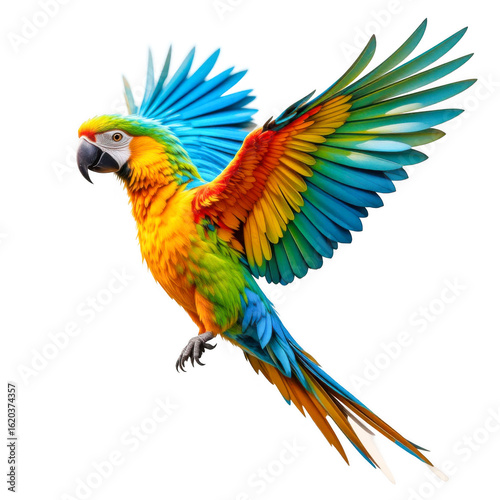 Fototapeta premium parrot spreading wings in mid-flight, vibrant tropical colors on transparent...
