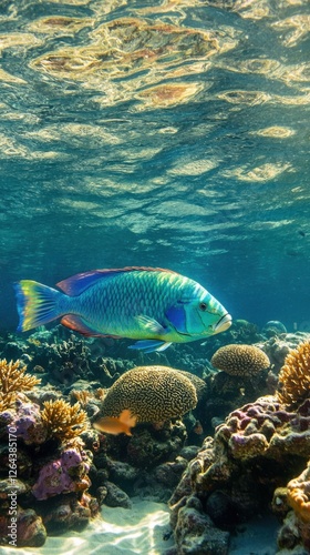 © Postproduction, Fototapeta premium Parrotfish feeding delicately on coral in a clear tropical reef.