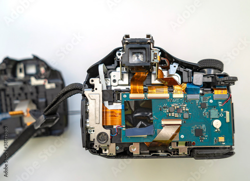 Fototapeta premium Parsing a digital camera. Digital camera in partially disassembled form, visible chips and loops.