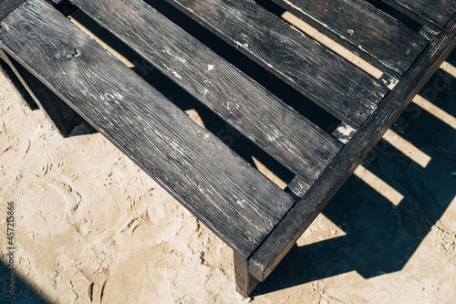 Fototapeta premium Part of a dark wooden deck chair on the sand.