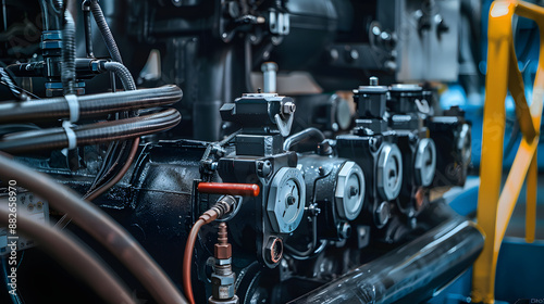 Fototapeta premium Part of a hydraulic industrial machine, control levers of a hydraulic machine, industrial concept