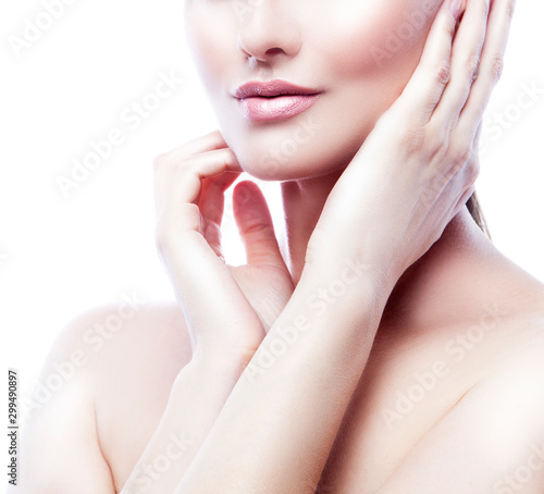 Fototapeta premium Part of beauty woman face with lips, shoulder and hand with clean skin and natural make-up.