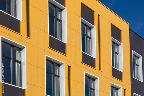 Fototapeta premium Part of building with metal facades of different colors and windows of...