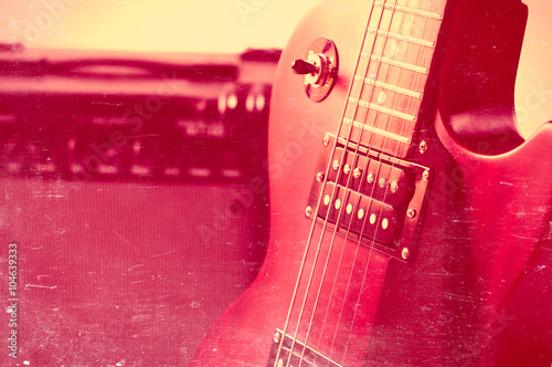 Fototapeta premium Part of electric guitar on wooden background. Old style