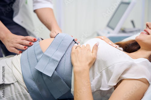 © Svitlana, Fototapeta premium Partial female gynecologist preparing belly of smiling pregnant woman for ecg
