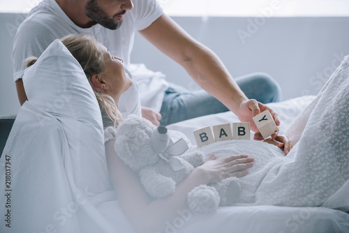 Obraz premium partial view of man putting wooden blocks with baby lettering on belly of pregnant wife with teddy bear at home