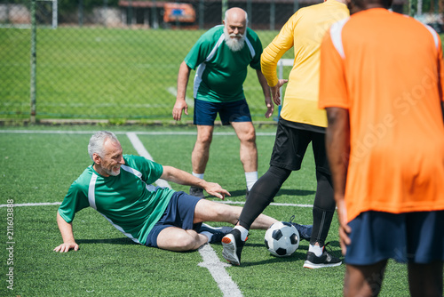 © LIGHTFIELD STUDIOS, Obraz premium partial view of multicultural elderly friends playing football together