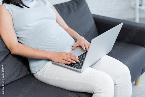Fototapeta premium partial view of pregnant woman working on laptop on sofa at home