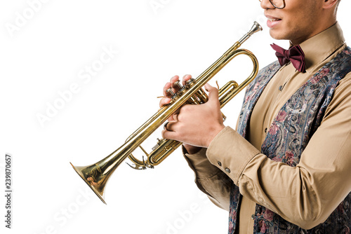 Obraz premium partial view of young male jazzman posing with trumpet isolated on white