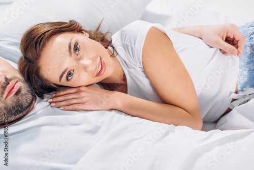Fototapeta premium partial view of young pretty woman leaning on boyfriend while resting on bed...