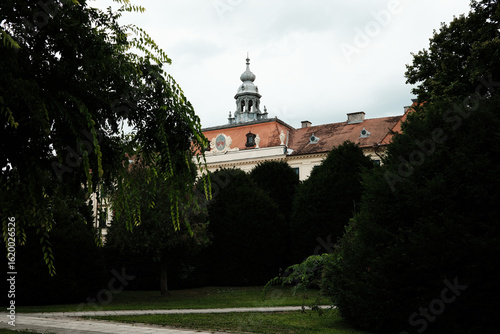© Ekaterina, Fototapeta premium Partially hidden behind trees, the historic Sombor City Hall with its decorative dome is seen from a side view in Serbia.