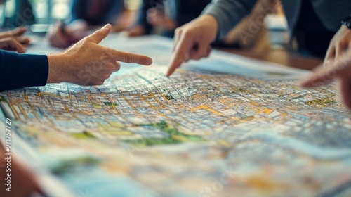 Fototapeta premium Participants are engaged in an urban planning meeting, actively pointing at a large map of the city while discussing various development sections and zones