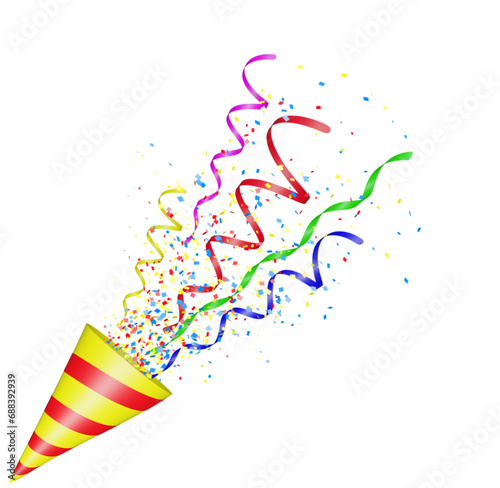 Fototapeta premium Party popper with flying confetti. Yellow and red firecracker explodes with serpentine. Birthday and anniversary banner with empty space for text. Isolated on white background