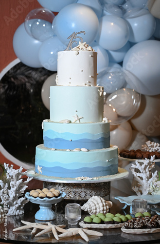 Fototapeta premium party room, birthday cake,table decoration, reception table, cake and sweet table, theme party, birthday party, cake with sea shells, maritime theme, 15th birthday party, a lot of balloons