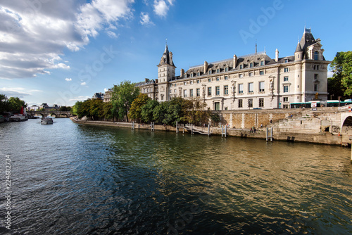 Naklejka premium Paryż, Francja - 13 sierpnia 2017 r. Widok Pałacu Conciergerie i więzienia na wyspie Cite z Sekwany. Popularny francuski punkt orientacyjny położony na zachód od Ile de la Cite, obecnie używany przez sądy.