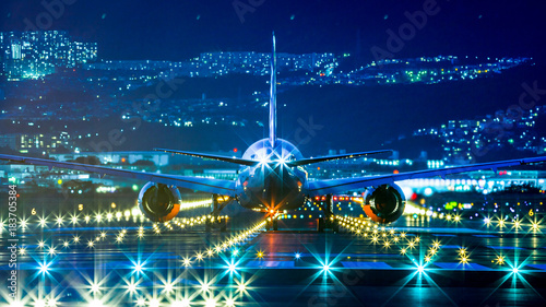 © beeboys, Naklejka premium Pas startowy i samolot, widok nocny