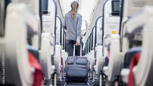 © sebra, Naklejka premium Pasażer w samolocie z walizką