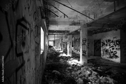 © Carlos Lorite, Fototapeta premium Pasillo interior en ruinas con columnas y paredes llenas de grafitis