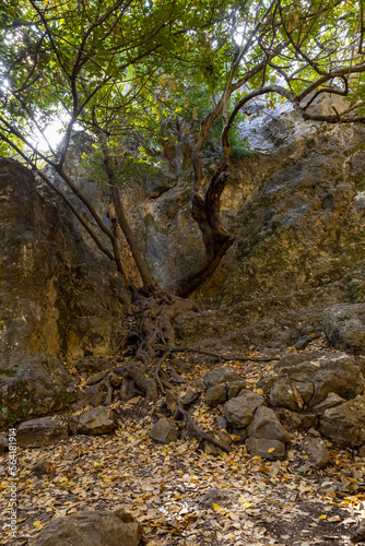Naklejka premium Passage through the gorge to the ruins of the Monfort fortress, located on a high hill overgrown with forest, not far from Shlomi city, in the Galilee, in northern Israel