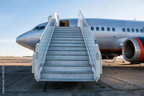 Naklejka premium Passenger aircraft with a boarding ramp on the airport apron