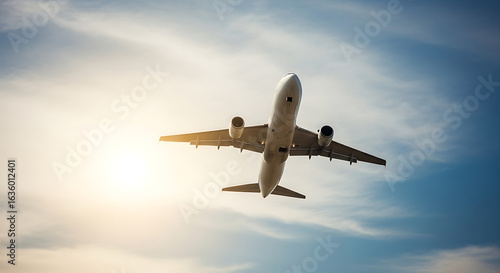 © Faris, Obraz premium Passenger Airplane Ascending Through Cloudy Sky.
