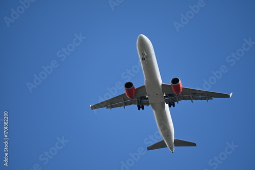 © Miroslaw, Fototapeta premium Passenger airplane in blue sky seen from below