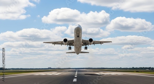 © ArtSync Studio, Obraz premium Passenger Airplane is Taking Off from the Airport Runway Under a Cloudy Sky