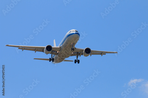 © Fotoglee, Obraz premium Passenger Airplane Taking Off Into The Blue Sky