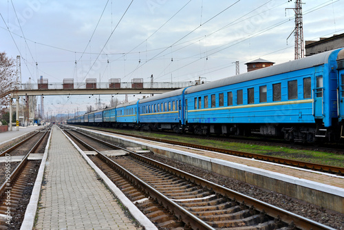 © andov, Obraz premium Passenger and freight train. Passenger diesel train traveling speed railway wagons journey light