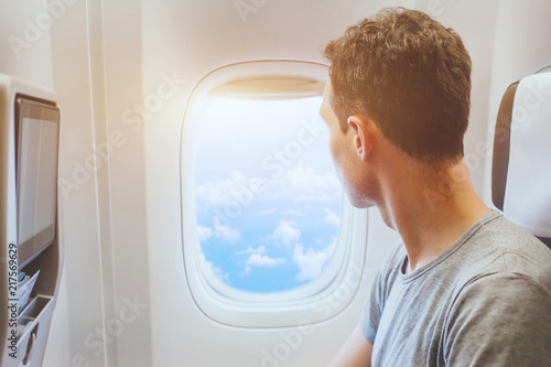© Song_about_summer, Naklejka premium passenger of airplane looking at window, international travel, happy man tourist enjoy flight in comfortable air plane