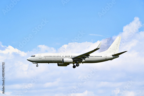 © Toni, Obraz premium Passenger plane landing at the airport, under a blue sky with white clouds