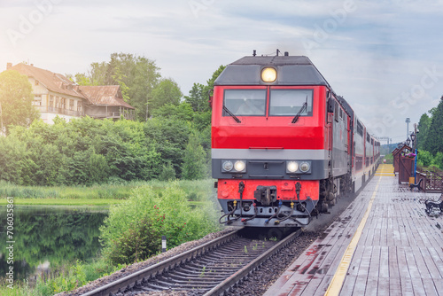 © serjiob74, Naklejka premium Passenger train approaches to the platform.