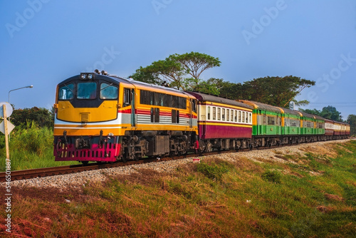 Fototapeta premium Passenger train by diesel locomotive on the railway.