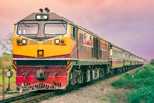 Fototapeta premium Passenger train by diesel locomotive on the railway.