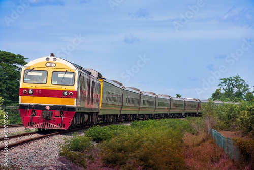 Obraz premium Passenger train by diesel locomotive passed the railway curve.