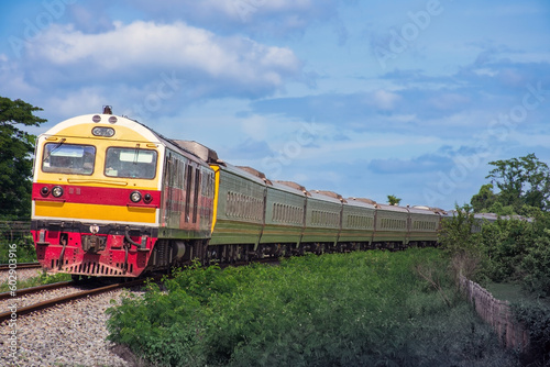 Fototapeta premium Passenger train by diesel locomotive passed the railway curve.