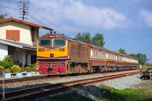 Naklejka premium Passenger train by diesel locomotive was arriving the station. (building is...