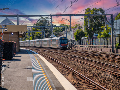 © Elias Bitar, Fototapeta premium Passenger Train going through Summer Hill train station a suburban Sydney train Station NSW Australia