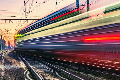 © serjiob74, Naklejka premium Passenger train moves fast at sunset time.