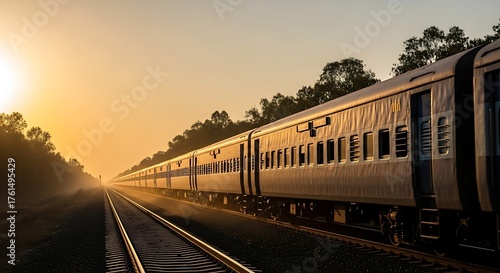 © MAHMUDUL, Fototapeta premium Passenger train traveling on tracks at sunset with warm golden light