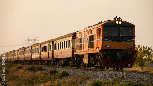 Fototapeta premium Passenger train was passing through rural field, 2015.