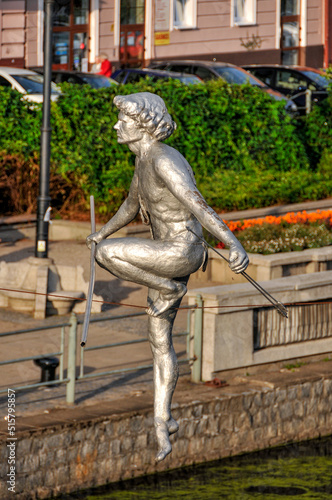 Naklejka premium Passing through the river - a sculpture suspended on a rope by the Brda River. Bydgoszcz, Kuyavian-Pomeranian Voivodeship, Poland.